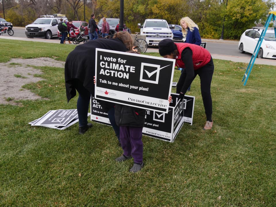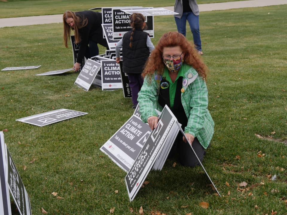 On October 11th and 12th 2020, I organized a participatory event on the lawn in front of the Legislative Building. Participants were invited to attempt to build the largest “house of cards” they could out of pre-made lawn signs that read “I vote for climate action: talk to me about your plan.” A local environmental organization that I volunteer for, EnviroCollective, ordered 1000 of these lawn signs ahead of the two elections we had here (provincial and municipal) this fall. The purpose of the signs was to get more people to consider climate change as an election issue. Candidates out door-knocking would also note that they had constituents who care about this issue. The signs were also meant as a way to spread knowledge of EnviroCollective, and they were supposed to be a fundraiser for this organization (as well as The Council for Canadians, who also contributed to their purchase).