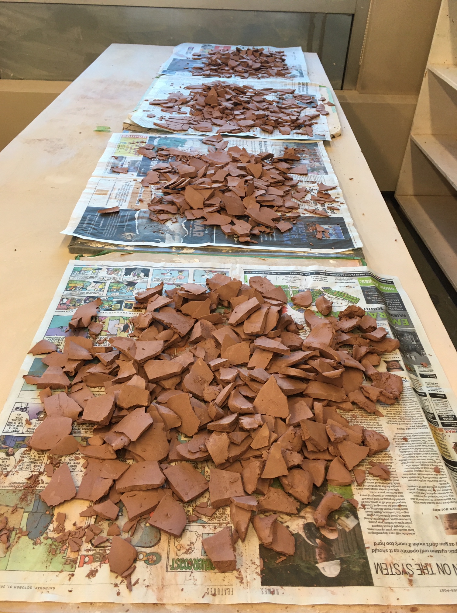 I dried and crushed the clay before soaking it in just enough water to cover it (“slaking it down”) to turn it into slip, a liquid form of clay.