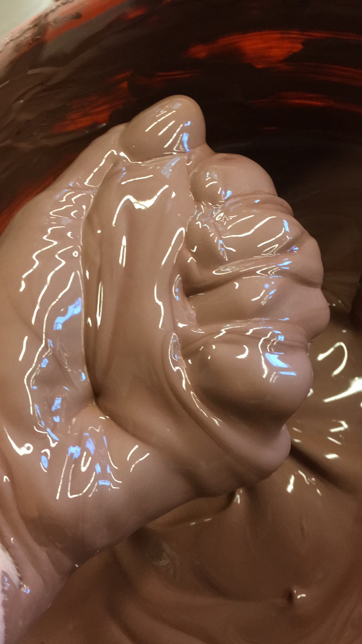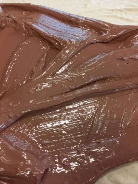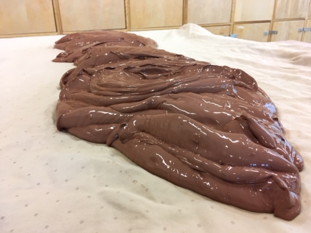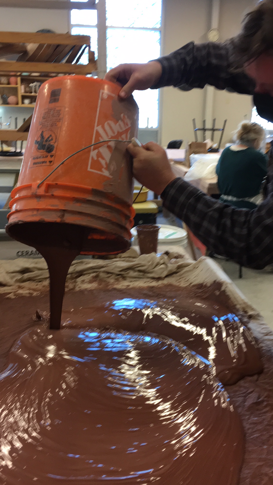 I thought it would be best for the slip to be as thick as possible so that there’d be less water to evaporate out of it before it dried. However, when the five gallon pail of it was dumped onto the table (thanks to Jesse Goddard for his help lifting it), I realized it was too thick. I wanted it to fill out the space I’d made for it evenly, but instead it just sat where it landed, a large… well… something between pudding and turd.