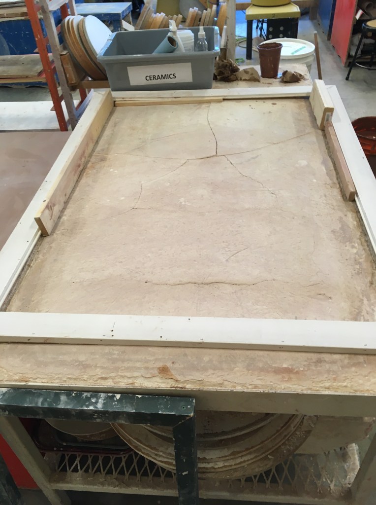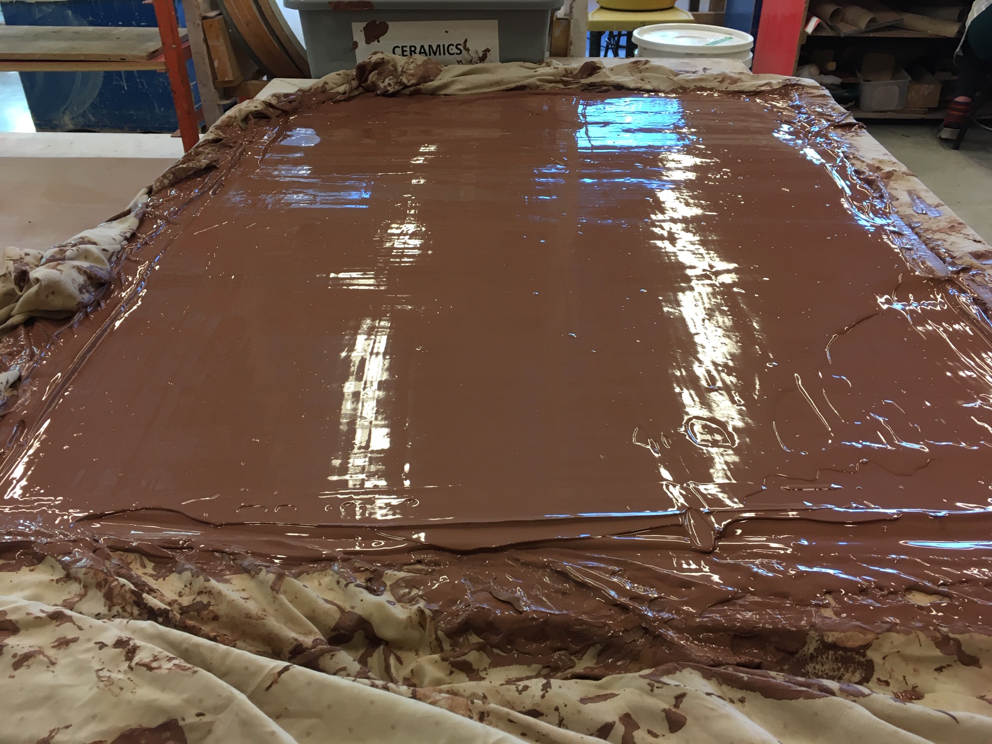 My prediction is that this will not produce the effect I’m after. Having a sheet under the slip (which I thought was necessary to keep it contained and to clean up the table afterwards) and using a plaster table will obviously cause the clay to dry differently from how mud dries on riverbed, but we’ll see. If this doesn’t work, I plan to dry it, smash it, slake it, mix it, and pour it again, perhaps on a 1″ bed of sand.