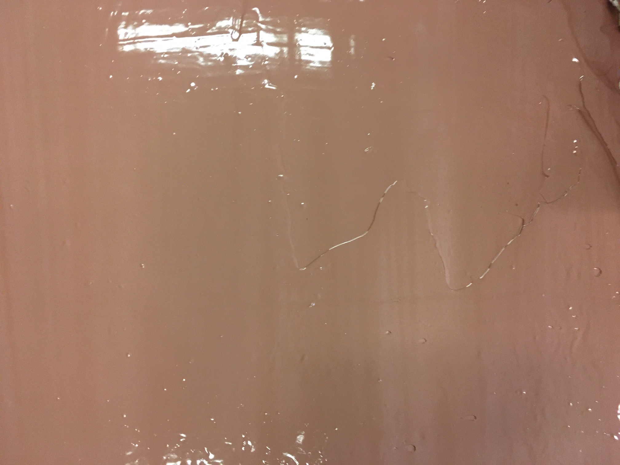 Second attempt at pouring the slip. It was still too thick to spread by itself, but it eventually worked out. A long piece of 1×3 wood helped smooth it over.