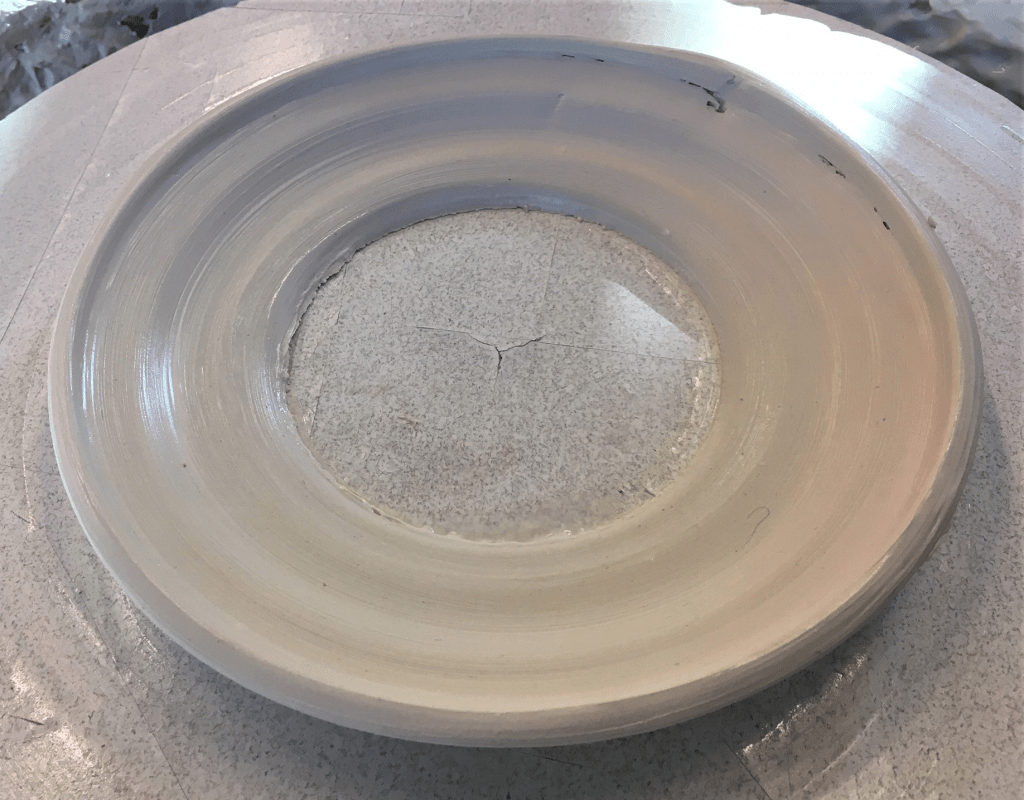 Creating this mold was much harder to do than I’d anticipated. Throwing a ring of clay the exact form of the bottom side of a plate is tricky. Of course, pressing the plate itself onto the ring of wet clay to get this form creates a suction … meaning that it’s nearly impossible to remove the plate without ruining the mold. It took a lot of fussing, and the result wasn’t great, but I figured it would serve well enough to tell me if this approach to making the dust plate would work.