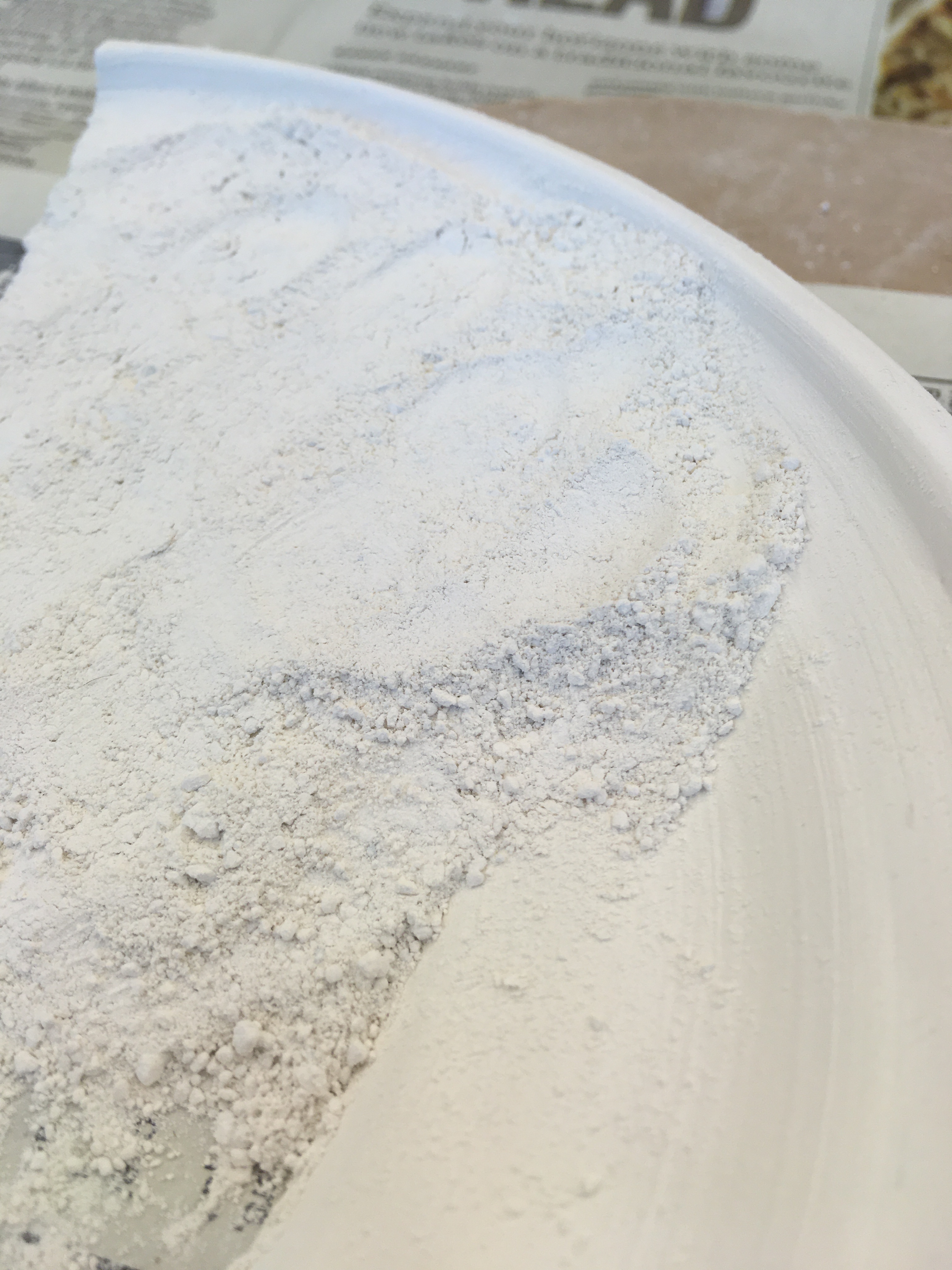 I threw a sort of press-mold to use for this project a few days ago. The form of the mold is of the space that exists between the bottom of a plate and the surface it rests on. I used one of my grandparents’ plates to create the form. The idea I have is that I would compress the powdered porcelain I’ve made onto this press-mold. Ideally, I’d not have to fire the mold, so it could be recycled once I’m finished with it.