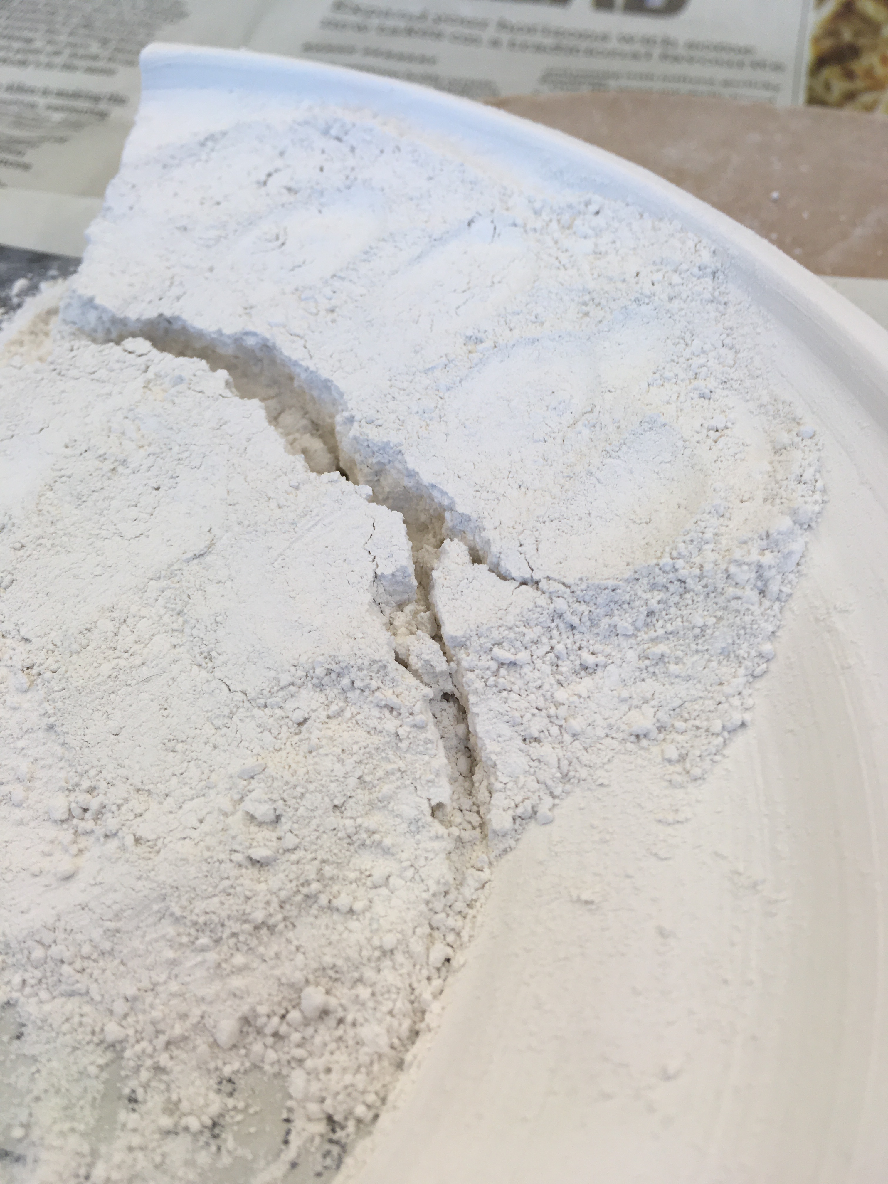 Today, I excitedly went into the studio to test it out. I figured that I could fire the mold if necessary to press the dust down firmly enough, but before doing so, I should play around with the it on the mold to see how they get along. They didn’t get along well, or to be more accurate, they got along too well. The porcelain dust stuck onto the mold (not much of a surprise) to the extent that it was 100% impossible to move the mold out from under it. Problem B.