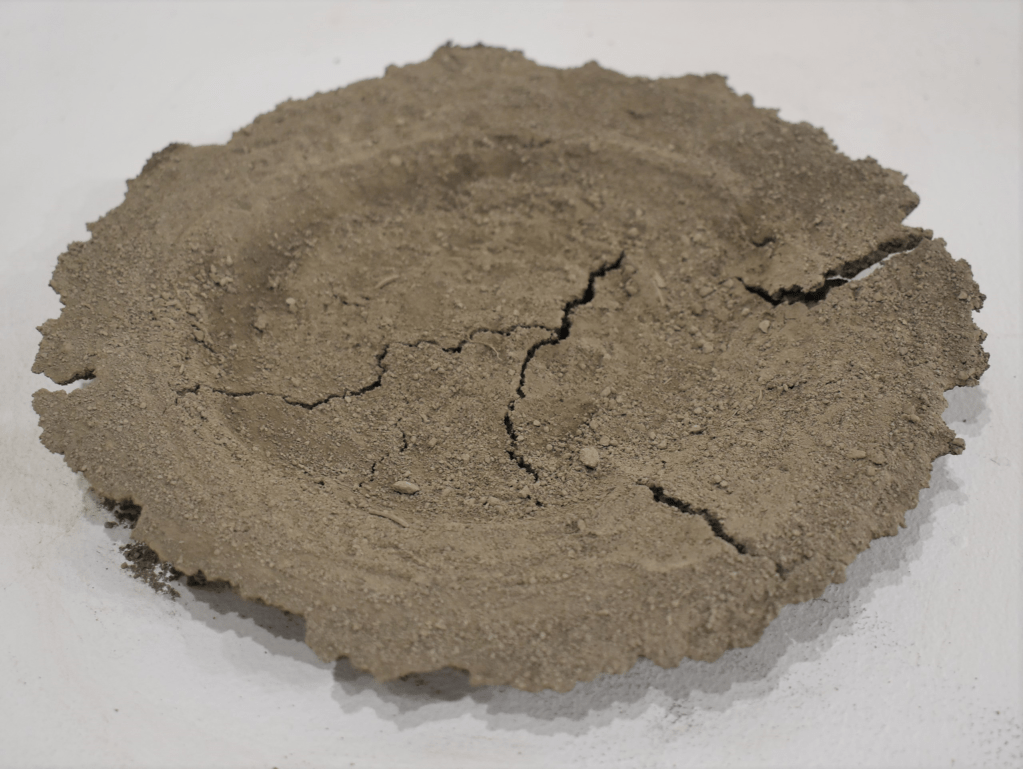 As with the other pieces I have in this show, I know I could develop this idea further and improve the end-product, the objects themselves. These aren’t perfect, and they’re far from what I’d originally envisioned: a plate that would look more perfectly plate like until it would blow away (on video), revealing that it was made entirely of dust. As with the other work in this show, though, I’m satisfied enough with the result of “Dust” after three months of experimenting and thinking about it. I’m now curious to see what others will say about it. I’m happy I decided to find and use local, brown-coloured clay, and I’m relieved that I found a technique that allows this clay dust to hold a shape. At least, these two pieces had held up for one day when I last saw them… I’ll return to the gallery when it reopens on Tuesday and see what I find on this plinth.