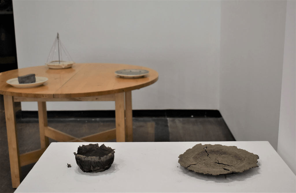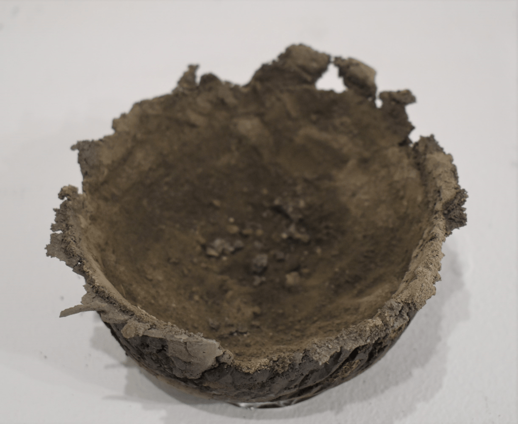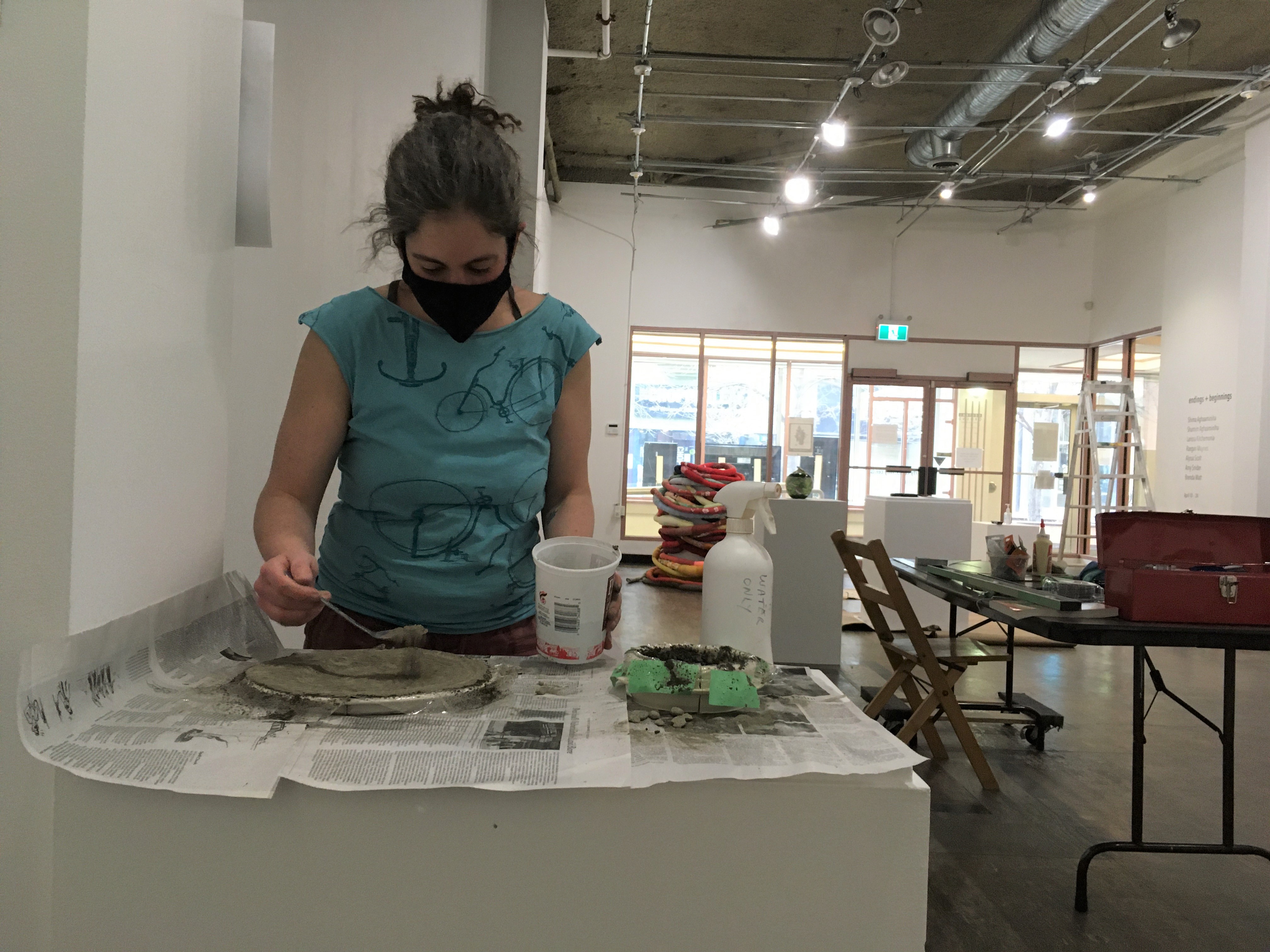 The plinth that I was expecting to use for a “Dust Plate” had been taken by another student (we had to book individual appointments to install due to Covid), so I was left with either one that was quite low to the ground or one that was much larger in width (more rectangular) than I’d expected to have. Fortunately, I’d brought the bowl-mold with me as well as the plate-mold, and I immediately realized that I was being told (by the art gods?) to go for it and create both a plate and a bowl in this gallery space. I took the larger plinth and got to work. This was my first time trying to use this mold in a while; the previous time had been a complete flop.