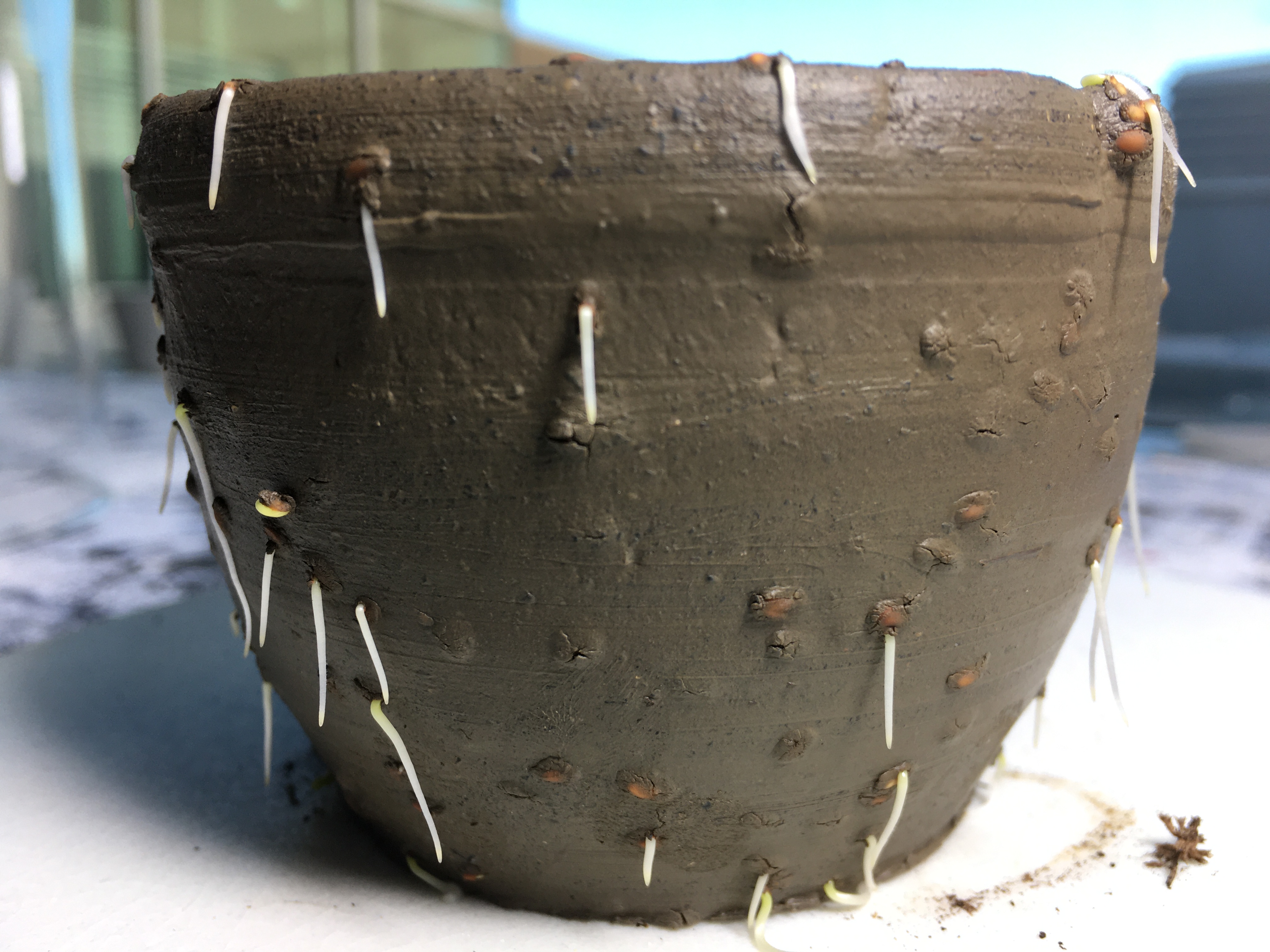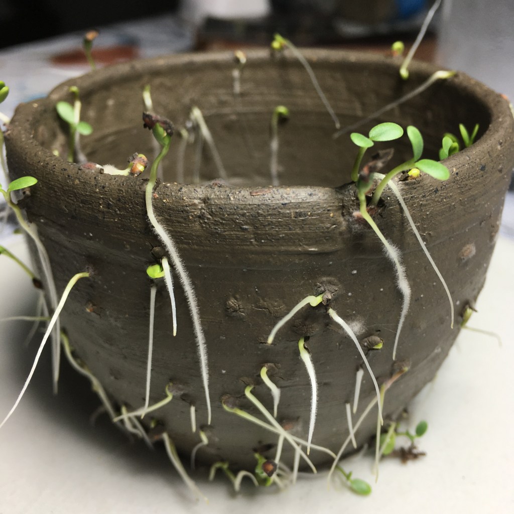 I’ve been experimenting with two ways to work through my grief in my art practice that may (I’m not sure) be incommensurate. First of all, I recently discovered that I am able to experience a small jolt of something like hope when I see life growing from my pieces made out of locally dug clay. For a few weeks I’ve been testing what happens when I add different seeds to different combinations of clay and compost, hoping to see life. It recently happened: I entered my studio to find germination taking place from a bowl I’d thrown on the wheel, and to me, it was the most beautiful thing I’d seen in a long time. I’ve repeated the steps, and the results are the same. In only one day, tiny green roots come bursting through the walls of a bowl to search for light and nourishment. I enclose these pieces under a bell jar, so they remain humid in their own small protective environments. It’s a simple act of plant reproduction, and yet it somehow feels magical to me. With a bit of water, these bowls literally come to life, and contrary to my “snowflake cups” and “dust plates,” life is what these pieces are about. However low I’m feeling, entering my studio and seeing these pieces somehow lifts my mood.