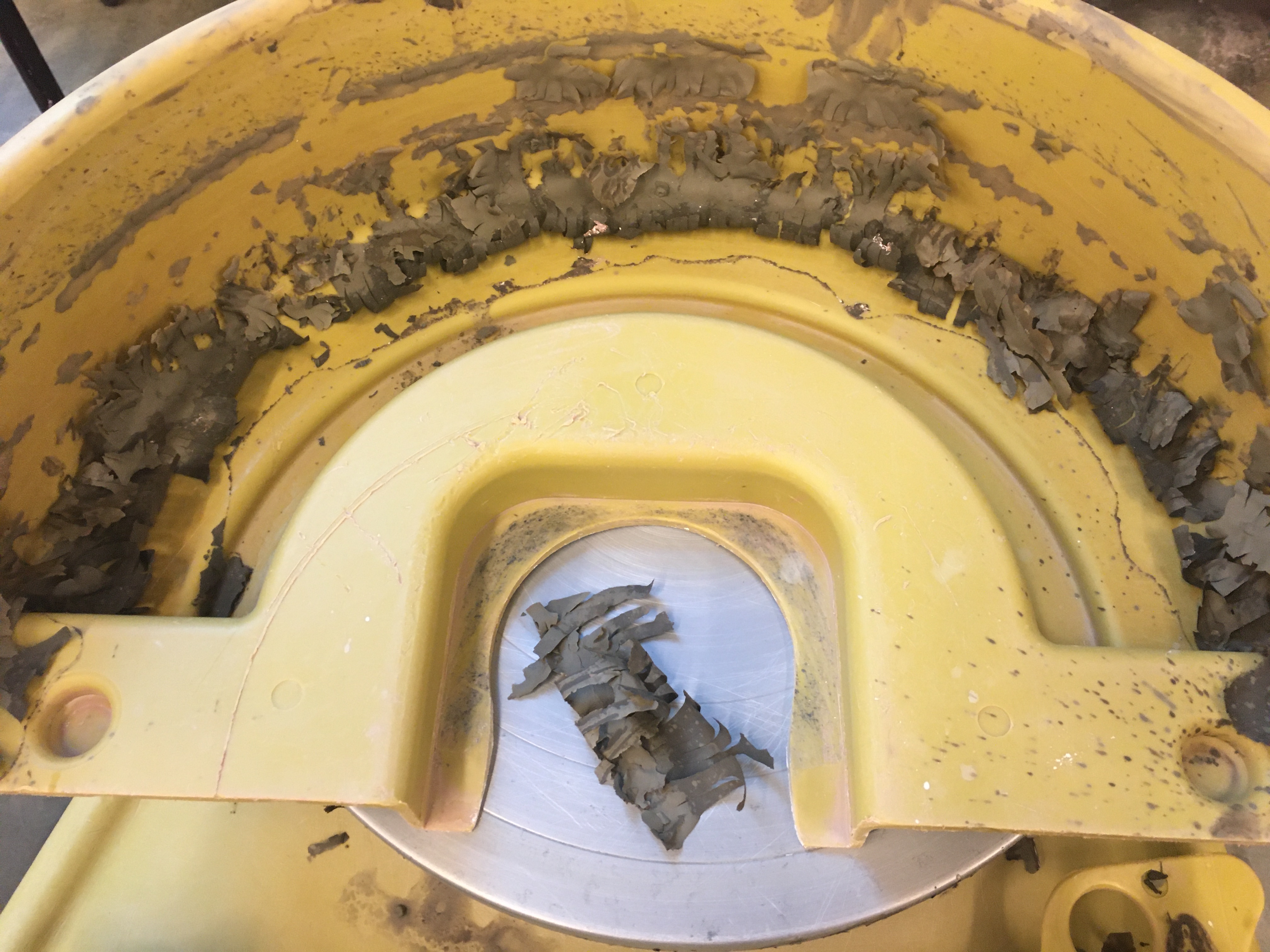 When poured into a plaster mould, which absorbs moisture more quickly than bisqued ceramic, this effect is magnified: