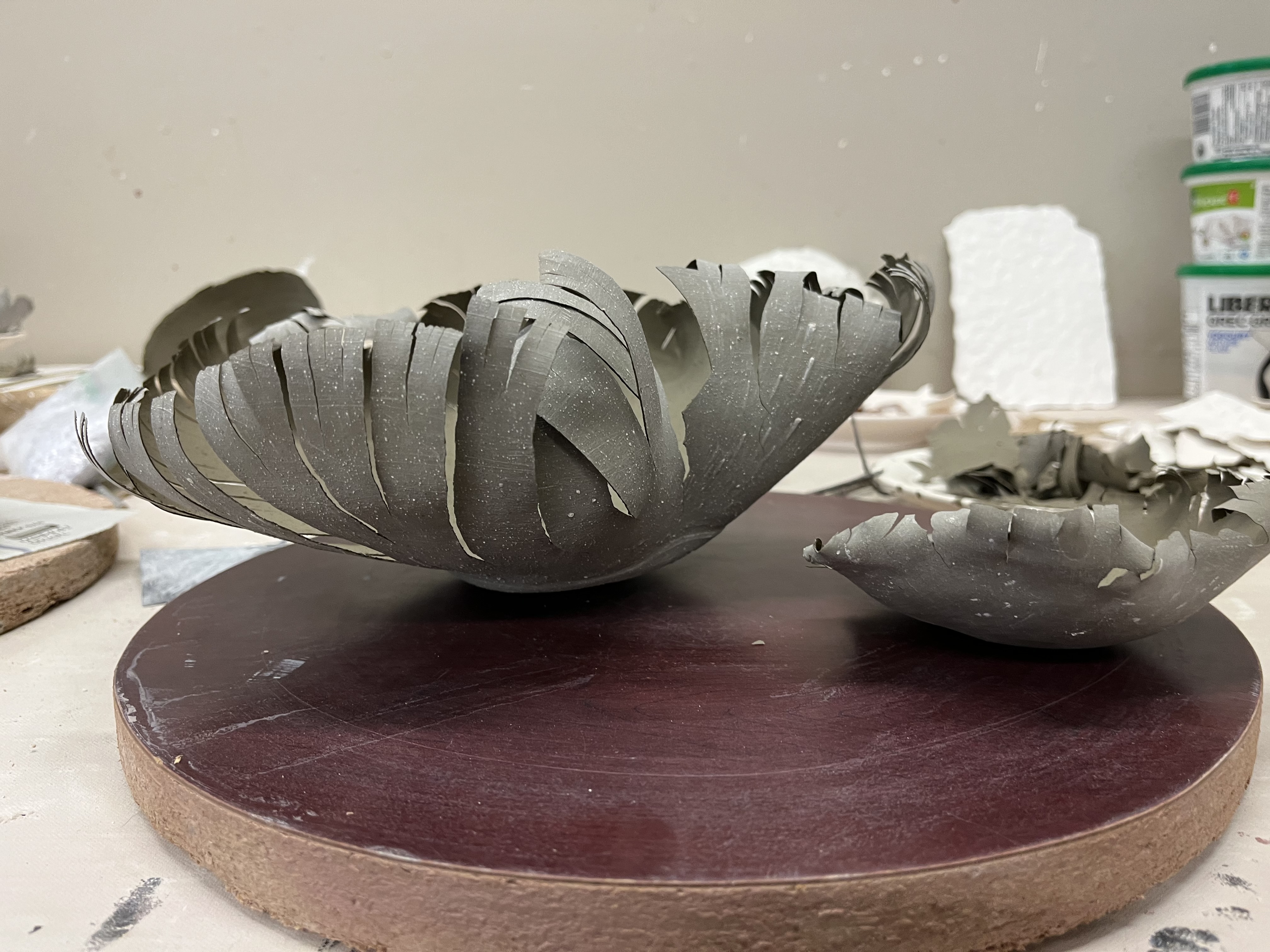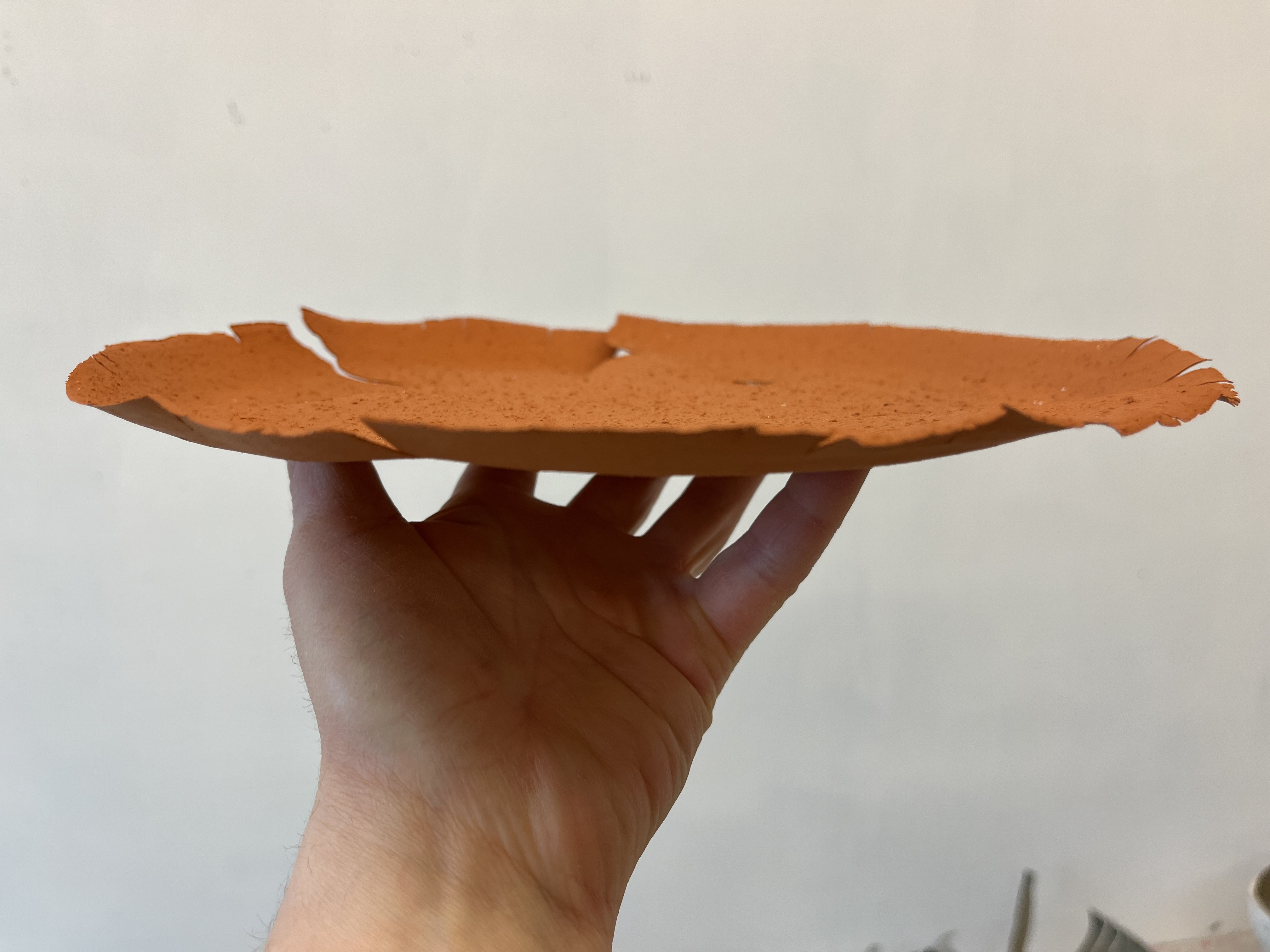 While working with the clay I dug from Madeleine Greenway’s garden last summer, I noticed it has a peculiar quality. Liquid clay that would hit the splash pan on the pottery wheel would peel off as it dried, unlike any other clay I’d ever thrown with before. I carefully collected and fired a few of these pieces, finding them intriguing and thinking that perhaps I’d find a way to work with them one day.