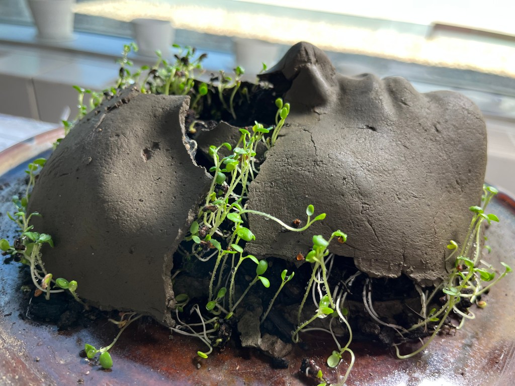 This is an alternate version of a cast I made of Jakob’s face with an extremely thin clay slip. It’s the same local clay body, just presented differently.