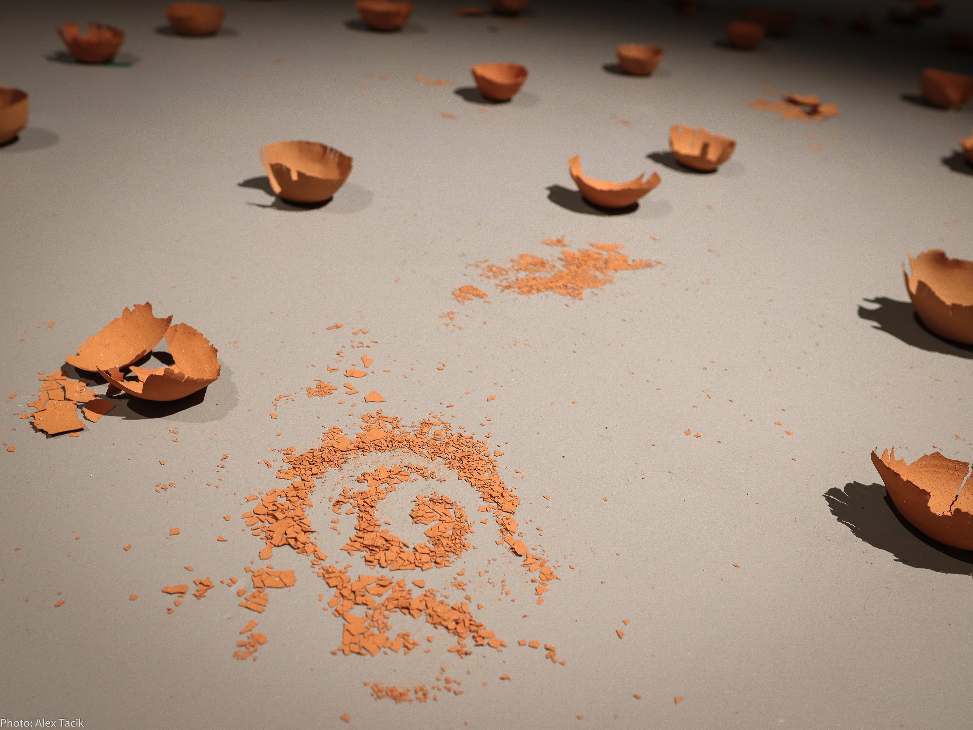 Drawing people towards the gallery was a recording of birdsong that I’d made in the same garden from where I’d dug the clay. Often, people peeked in from the doorway with curiosity: what was this birdsong, and what are those objects on the floor? They hesitated, not sure if they were allowed to enter. If I caught this, I beckoned to them, telling them they were welcome. Several asked if they were supposed to break the bowls. I told them that I wasn’t there to direct them in any way—that they should interact with the work however they chose. If they asked what the show was about, I told them they could come to their own conclusions by reading the text on the walls.