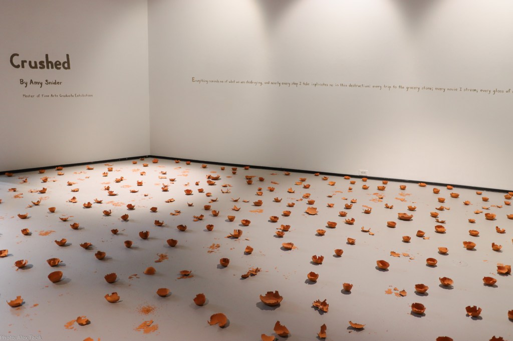 My MFA thesis exhibition, Crushed (August 2024), was a conceptual installation about climate change anxiety. The gallery floor was covered with over 2,000 eggshell thin ceramic bowls made from clay I dug up in Regina. To read a text painted onto the gallery walls with this clay, you needed to become a participant: would you step carefully between the bowls, perhaps tiptoeing or raising your pant cuffs? Or would you stomp ahead, satisfied by the sound of shattering ceramic beneath your feet? What would you leave behind for others?