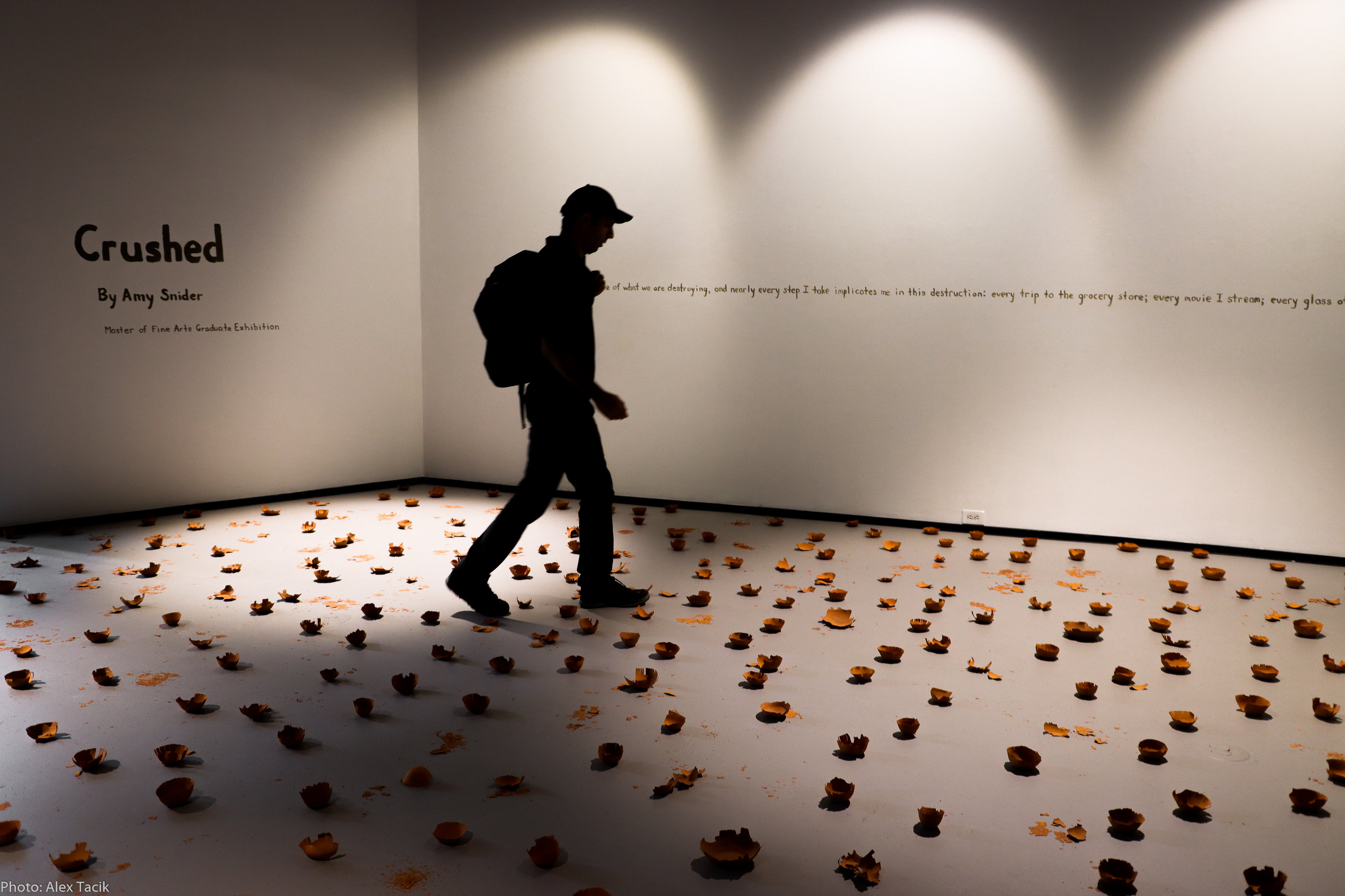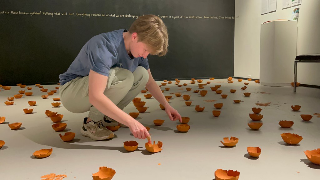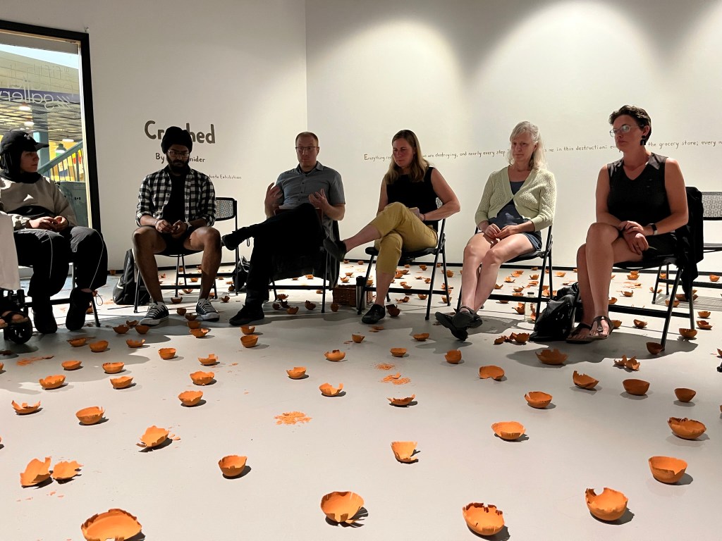 On the second day of the exhibition, I spoke with an amazing 11-year-old who started a climate club in their school. They shared that climate change keeps them up at night. We talked for about an hour. Before they left, they told me the show helped them feel less alone and encouraged them to take more action. With that one conversation, I felt I’d accomplished more in a Masters degree than I’d ever fathomed I would. We are still in touch; I’ve become a bit of a climate-action mentor to them, and they inspire hope in me. I understood from day two of Crushed that my being present for these conversations was a part of the show itself.