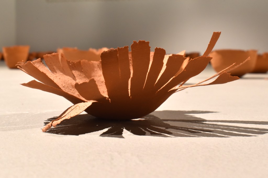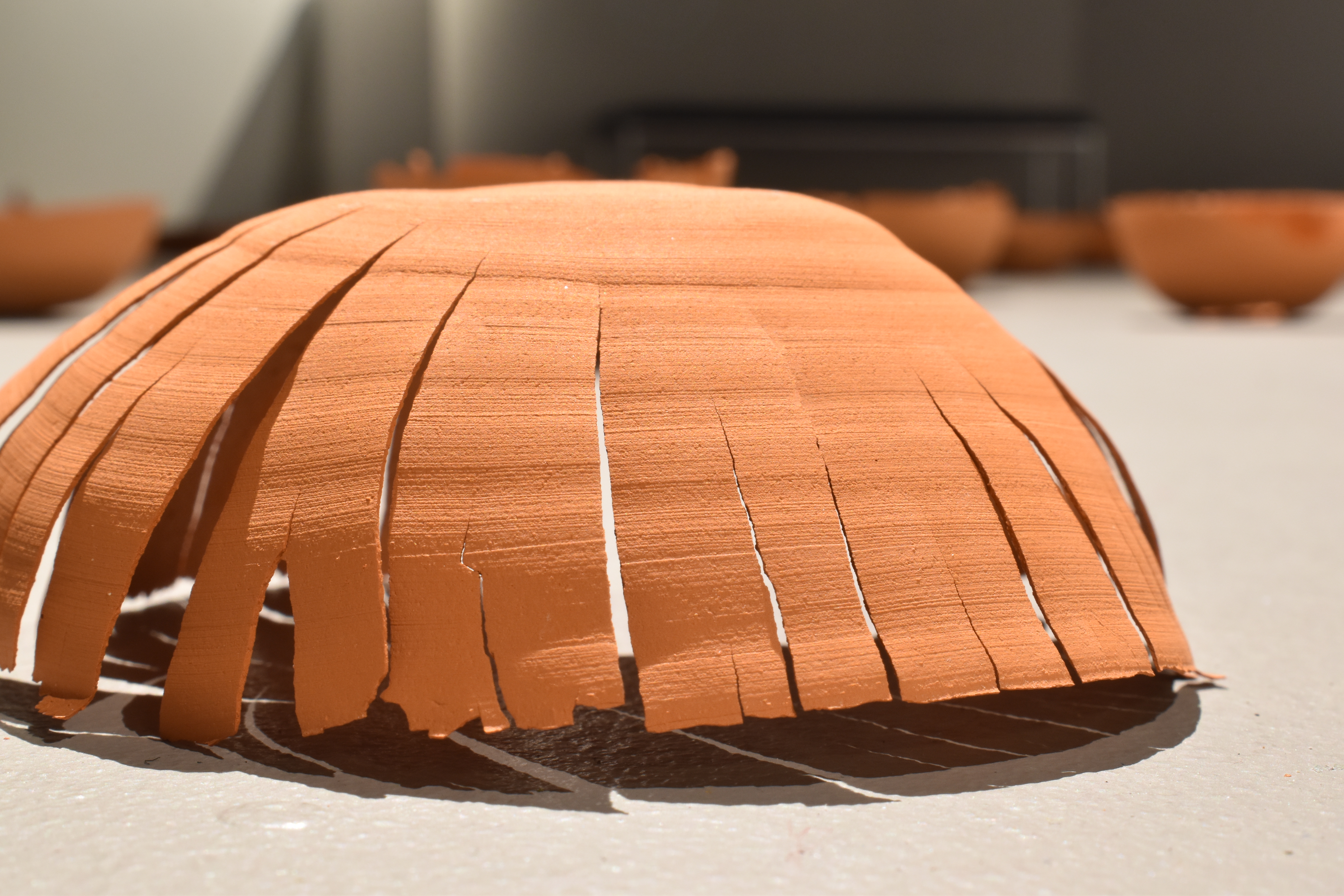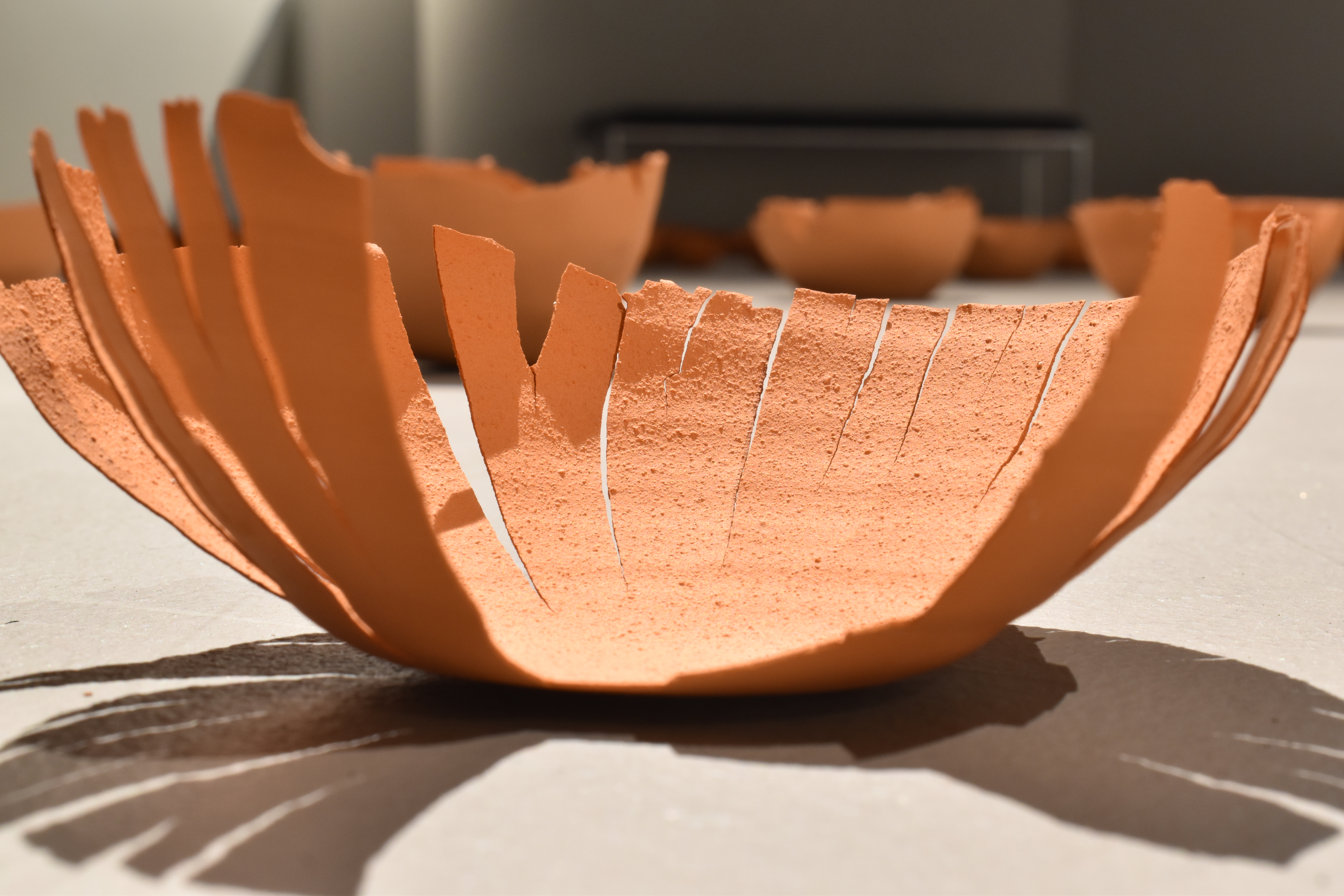 Each bowl started off already broken in its own way, many frayed and splayed into hardly-bowls-at-all. Vestiges. Unlike the pottery of long ago which we uncover today and use to learn about our past, these pots will not last. Fragile, like ourselves at this time of precarity for nearly all life on Earth, they mimic our position as a species at large, and for some, they mimic our own vulnerability. That they will not last is both their form and their content.