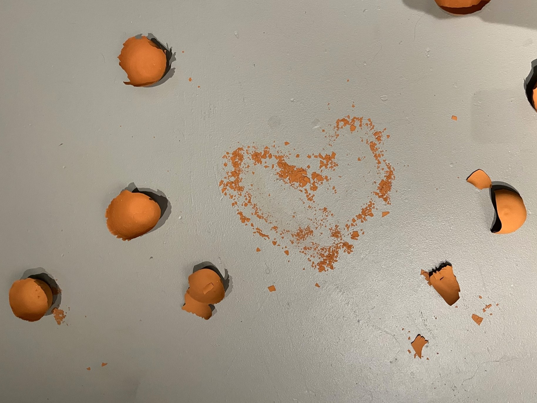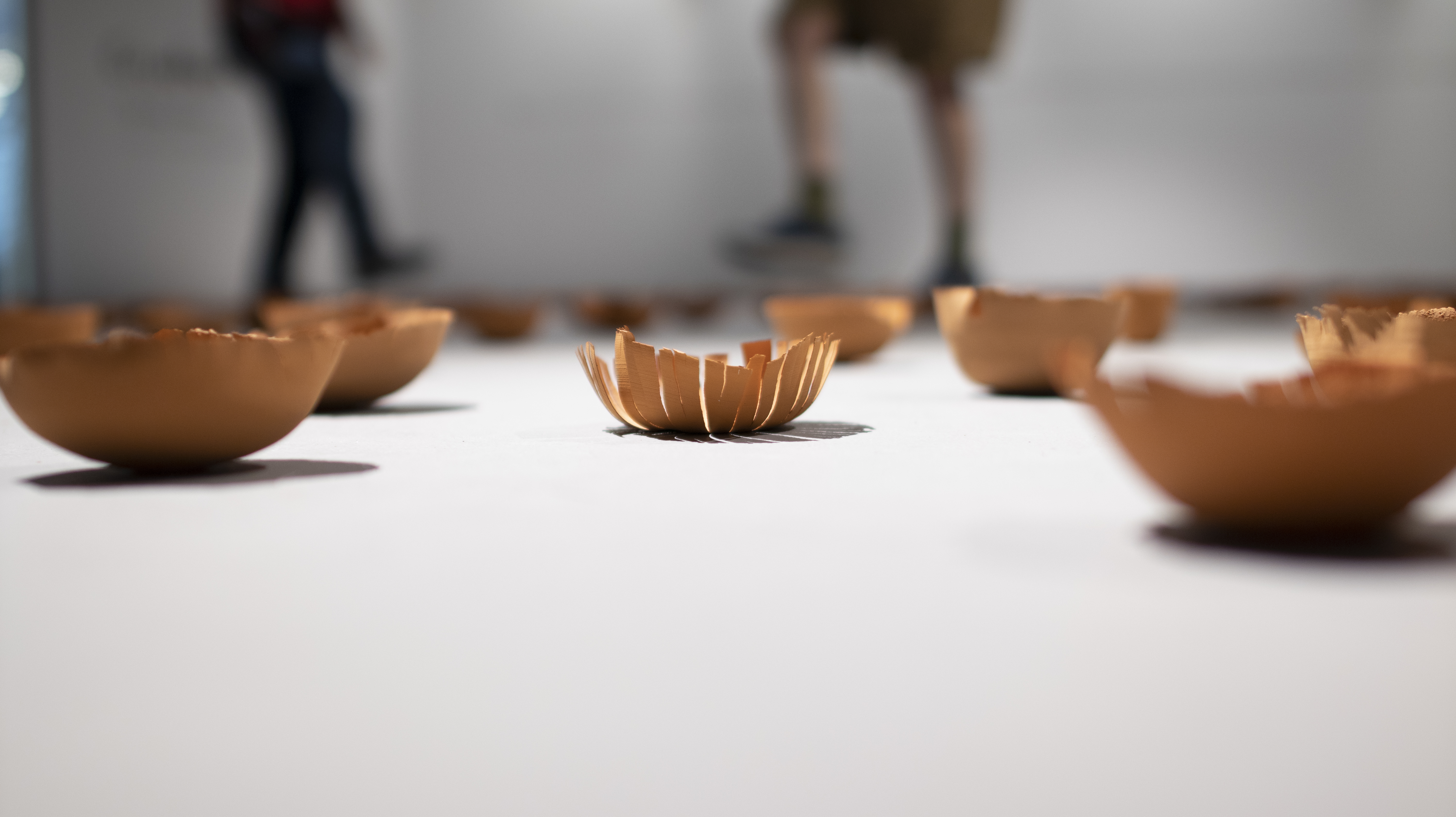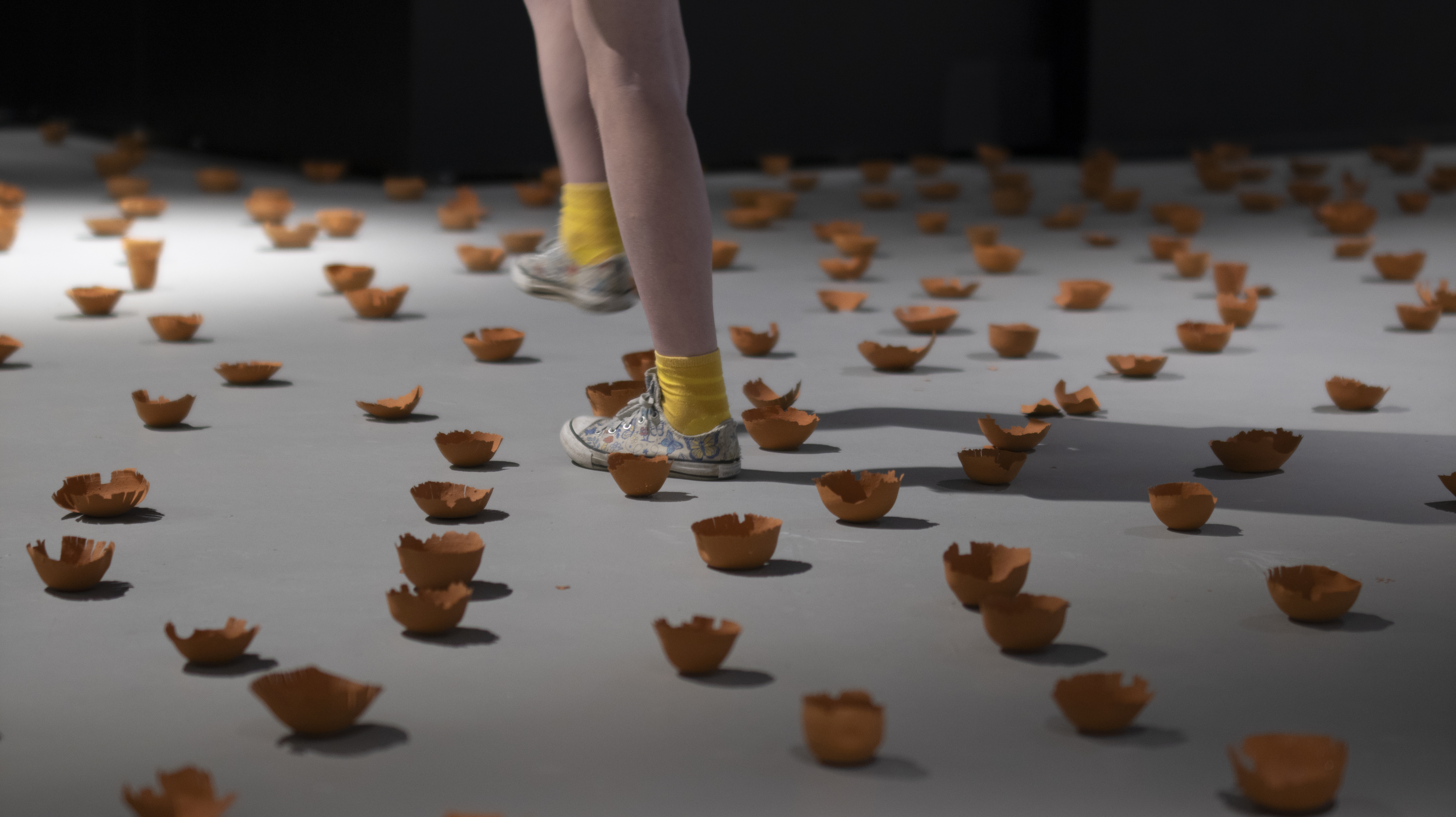 It was incredible to see how people participated with the work. During the months of preparation, I’d wondered if anyone would start off by stepping on bowls but then stop after reading the first sentence of the wall text. It was my hope that this would happen at least once. It happened several times. A few other predictions I’d made played out. Then there were the many other unanticipated interactions with the work. One young person balanced bowls across their arms and head; another squatted and spun the bowls around, making music with their unique, tinny sounds. Someone created a heart shape with the pieces of a shattered bowl. Others copied or created their own designs. A boy went racing across the floor, skipping over bowls while increasing his confidence and speed until his parents told him to stop.