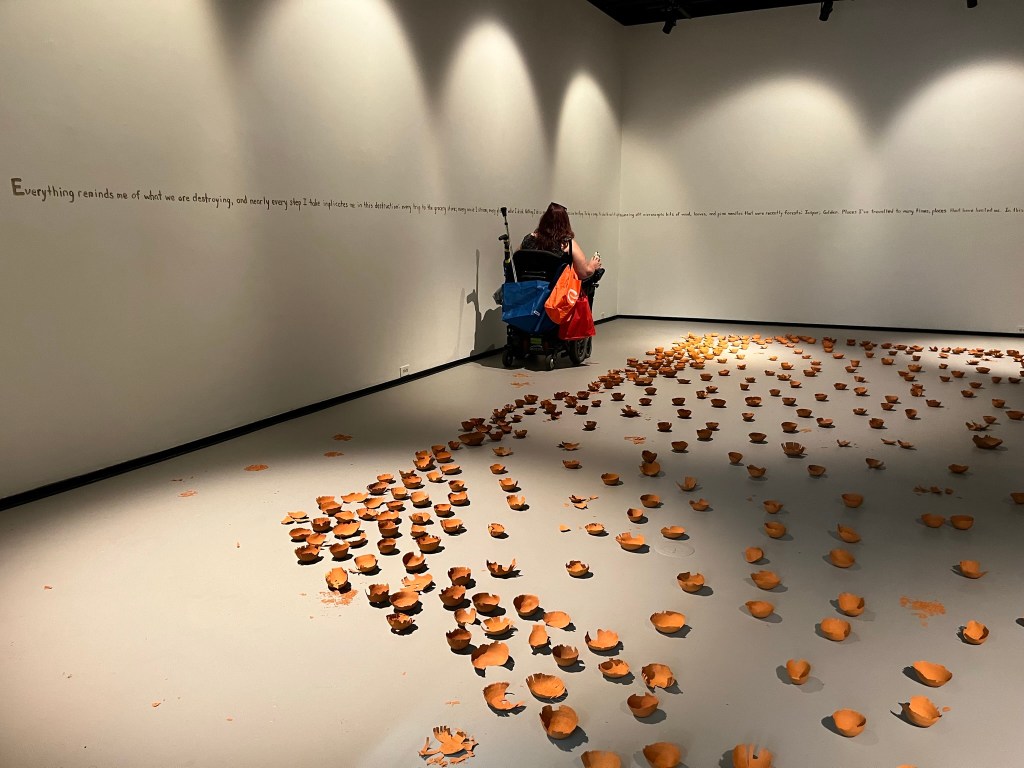 One question I’d had in the lead-up was how this installation could accommodate people with mobility issues. I realized it was a very ableist show in that the experience I’d intended was only possible for people who could walk on two feet. The whole idea was that people had to choose how they’d interact with the work on the floor. A person in a wheelchair would not have that choice. What I ended up doing when the first person in a wheelchair approached was to ask her how she wanted to engage with the installation. I offered to clear a path for her wheelchair, and she accepted. On two other occasions, I cleared this path for people to participate in the installation this way. I had an eye-opening conversation with a person in a wheelchair about the lines she drew between the lack of sufficient care in our healthcare system and our lack of care for the environment.