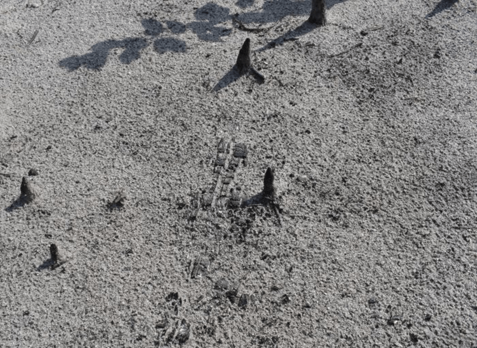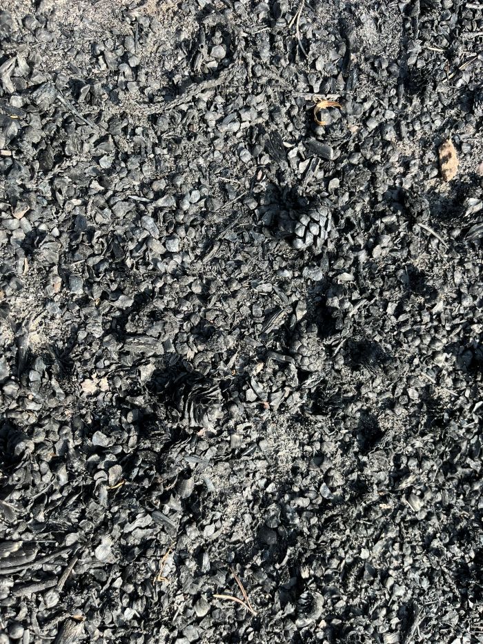We walked through more patches of moonscape. In a few places, we couldn’t tell what ash and what was sand, everything blended in soft browns, greys, and ochres. Brushing it with my hand, I could see layers—white, black, orange—and feel the difference in touch. What had this place looked and felt like before the fire? What smells and sounds had been here, too?