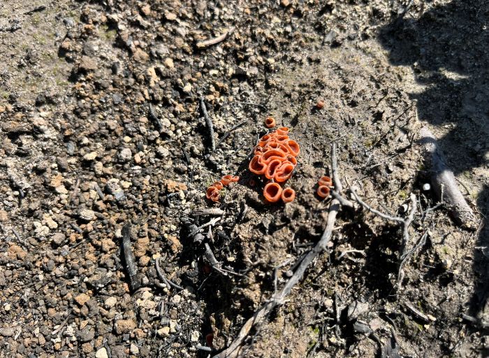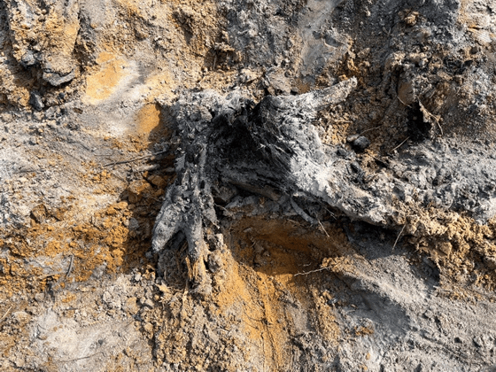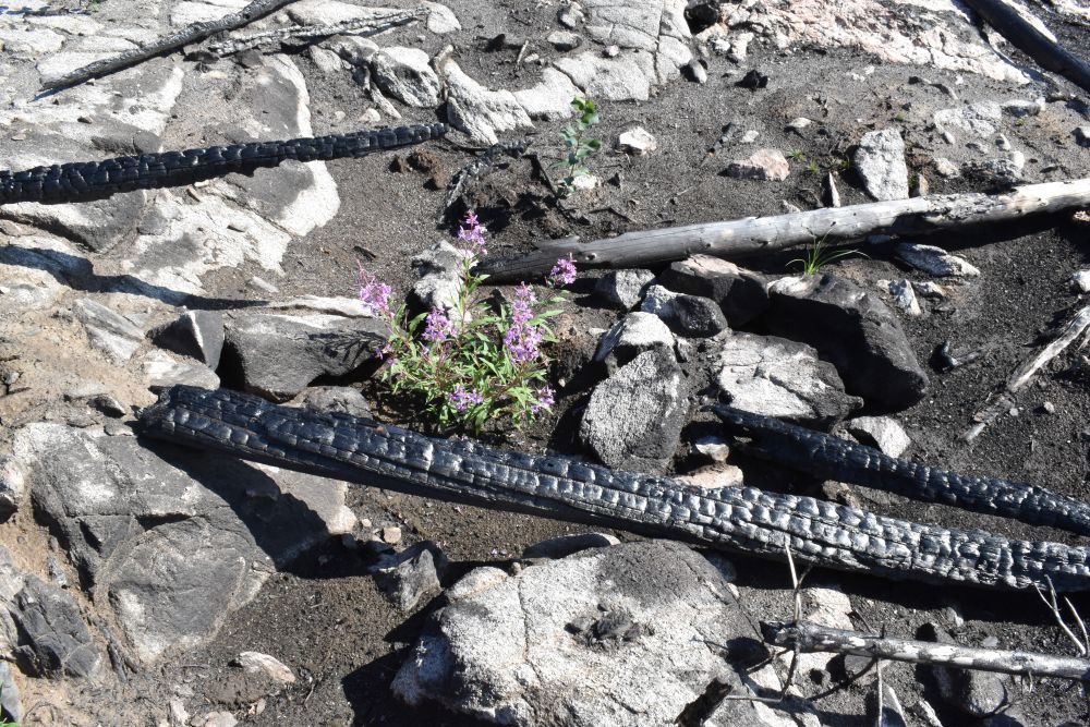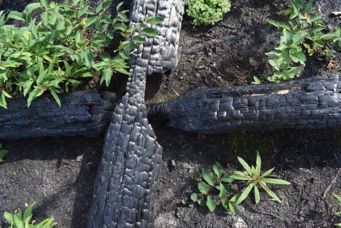 Everything else there appears gone*—the trees and other plants, leaf litter, mosses, lichen, fungi—everything, even the soil. Only tiny conical stumps, black and pointy, remain of entire trees. It looked somewhat like an archeological dig-site in places.