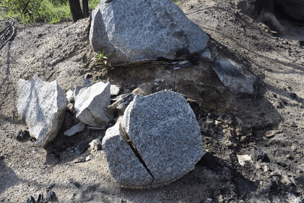 The fineness of the ash reminded me of the Rocky Mountain glacial rock flour I love. Here, the process of erosion is taking place visibly. Rocks, even large boulders, had gotten so hot in the fire that they exploded and now lay in fragments. One piece I picked up had some kind of larva living on its underside, in the ash. Ants were here, too.