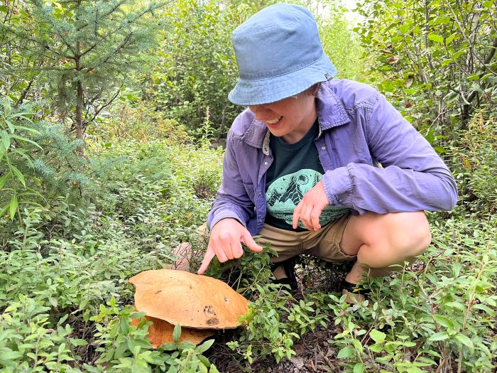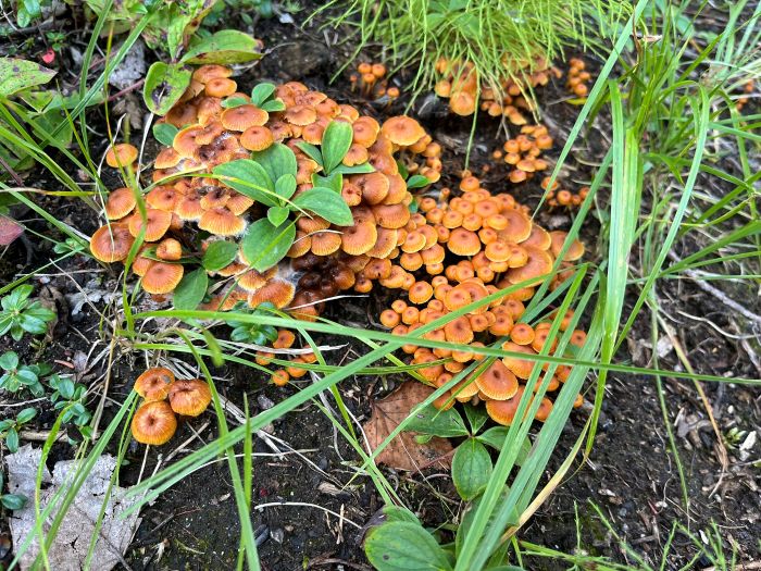 As we reached the forest line, though, there it was: a clear path in the trees. How did she know? This had been invisible from the lake. Suddenly we were hiking on solid ground amid trees, plants, and a rainbow of mushrooms.