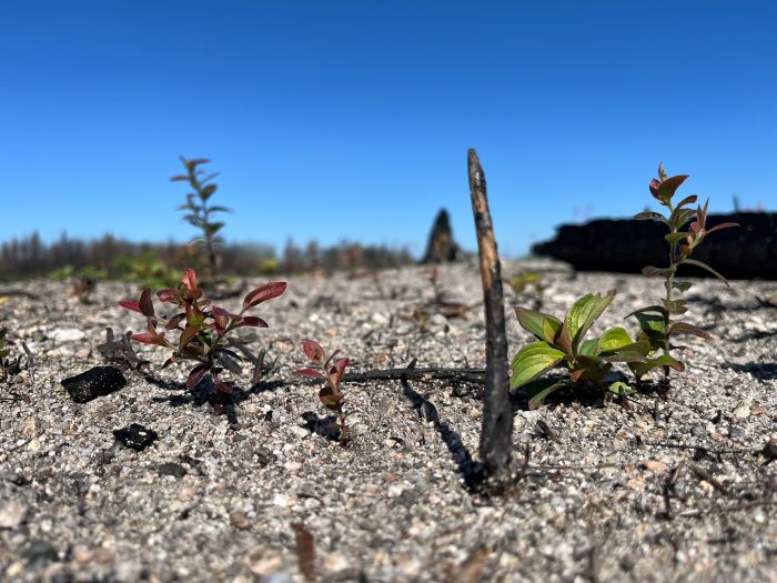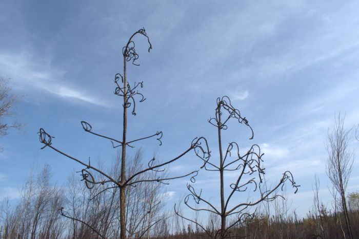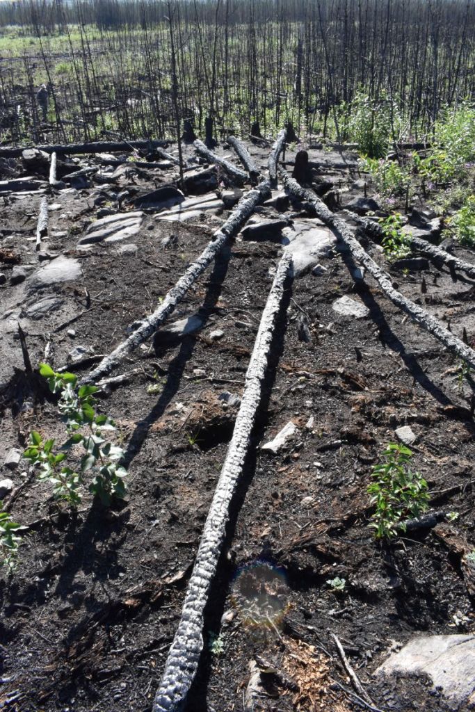 I collected ash and skeletons of dead trees to take home to Regina for artistic research purposes. Miriam showed me areas where the fire could have burned on forever; it was underground, a ladder fire—anytime it came to a tree with low, dry branches near the ground, it would set the tree aflame. Trees without low branches could be left untouched.