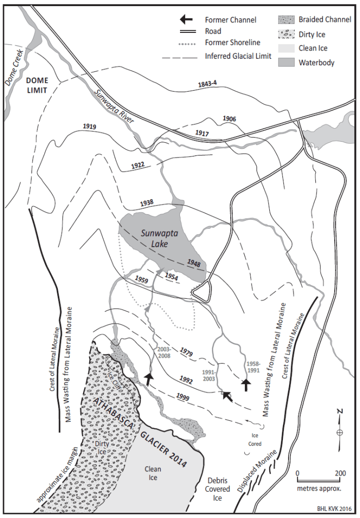 While working on this piece, I sought actual data on the recession rate of the Athabasca Glacier. Through sheer luck, I got a hold of Robert Sandford, the Senior Government Affairs Liaison for Global Climate, Emergency Response at the United Nations University Institute for Water, Environment, and Health. His book, Our Vanishing Glaciers: The Snows of Yesteryear and the Future Climate of the Mountain West has been foundational to my art practice. He put me in touch with Michael Demuth, a geoscientist, hydrologist, and glaciologist also working in the area of water security in Canada. (His book, Becoming Water — Glaciers in a Warming World, is another must-read). Michael sent me this map created by Brian Luckman, depicting the recession of the Athabasca Glacier from 1843 to 2014. I noted that in 1917, the glacier’s terminus was right on what is now the Icefields Parkway which was built between 1931-1940.